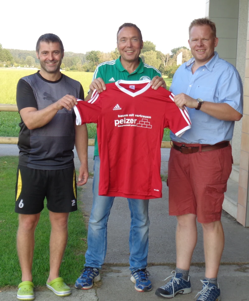 Torwart Felix Pelzer, Bauleiter bei der Firma Pelzer Baugeschäft GmbH („bauen mit Vertrauen“) waren die in die Jahre gekommenen Trikots ein Dorn im Auge. Kurzentschlossen wurde ein neuer Satz organisiert. Die AH Mannschaft des SV Schlingen dankte dem Sponsor und gewann gleich beim ersten Spiel im Neuen Dress gegen die AH Mannschaft des TSV Lengenwang mit 6:0. Felix Pelzer (rechts) übergab die Trikots an den 2. Vorsitzenden Gerd Seemüller (links) sowie den AH-Leiter Michael Fuchs (Mitte) (HPM).